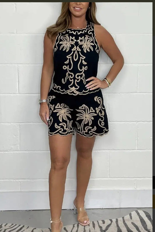 Embroidered Round Neck Top and Vest Shorts Set