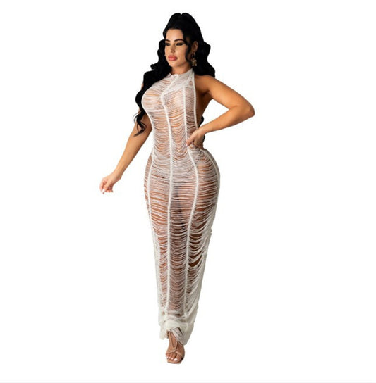 Knitted Tassel Halter See-through Beach Bag Hip Long Dress