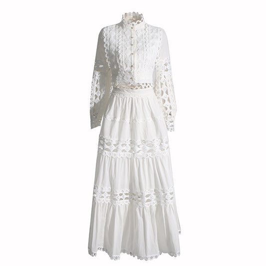 Lace Collar Long Sleeve Midriff Outfit Shirt High Waist Skirt Solid Color Two-piece Set