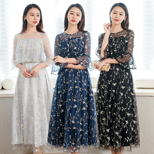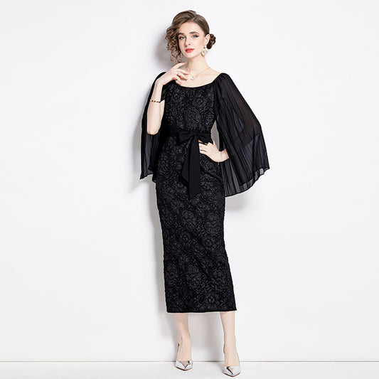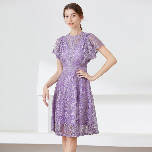 Lace Midi Dress Flying Sleeves Temperament Waist-controlled Slimming