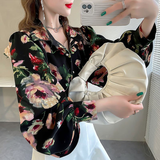 New Loose Lantern Sleeve Chiffon Printed Shirt For Women