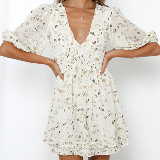 Fresh Chiffon V-neck Printed Short-Sleeved Dress Women