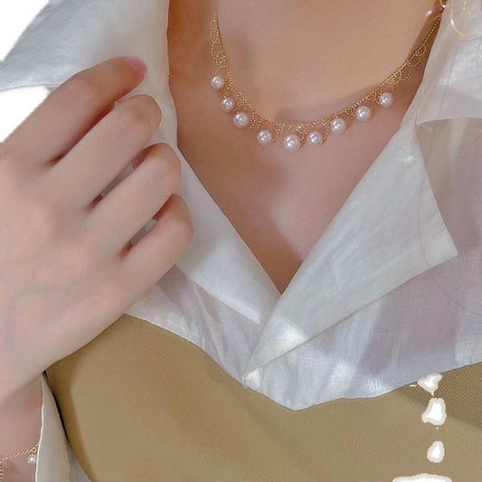 18K Gold Inlay 7-7.5mm Natural Seawater Akoya Pearl Necklace Collarbone Chain