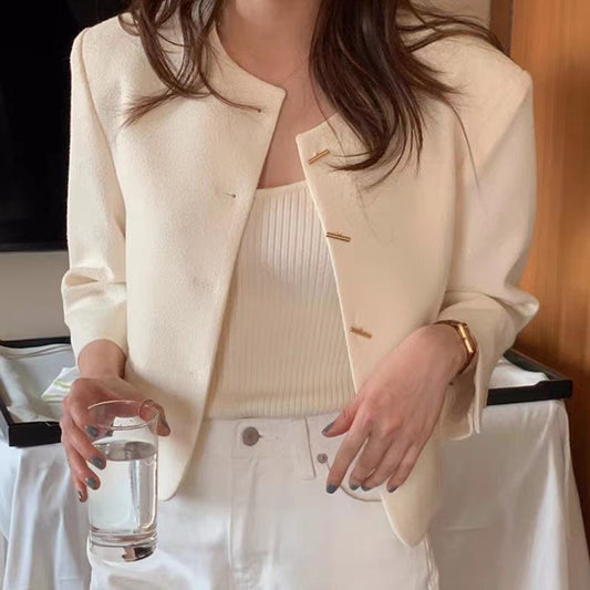 Chic Minimalist French Style Temperament Round Neck Single-breasted Loose Casual All-match Long Sleeve Short Coat