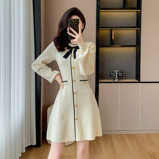 French Style Goddess Temperament Dress Winter Lantern Sleeve Collar Knitted Dress
