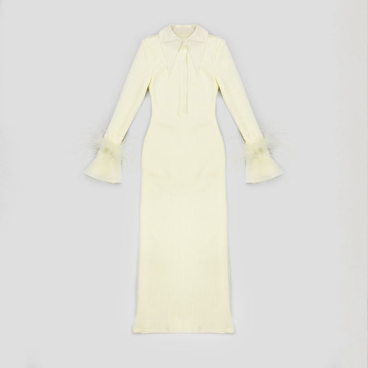 Vestido ajustado con puños de plumas y cuello alto elástico de manga larga