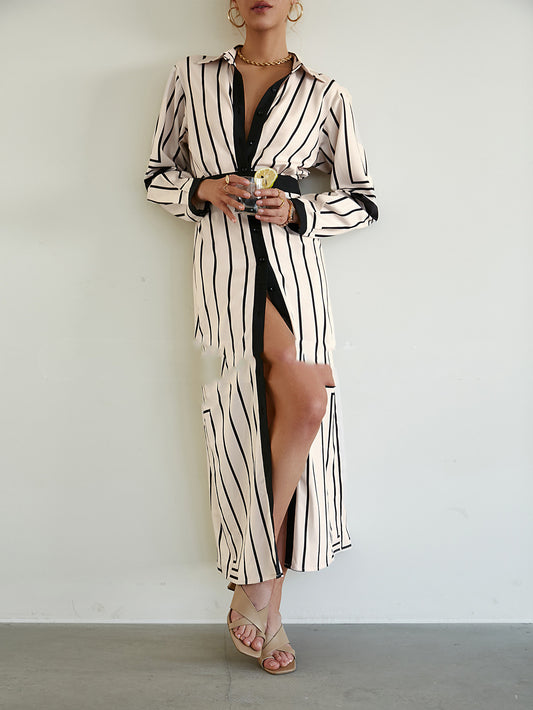 Vestido largo de moda blanco de talle alto con cuello alto y rayas