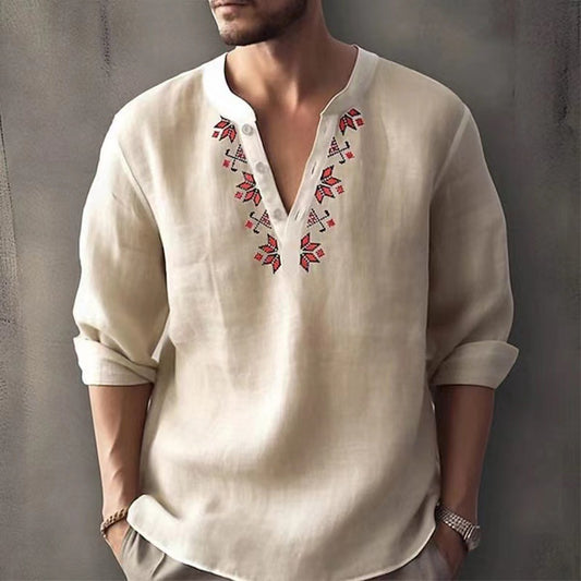 Camisa suelta de algodón fino y lino con cuello alto