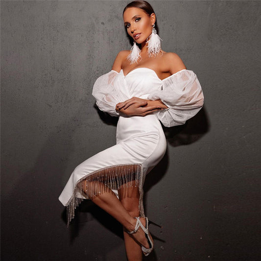 Vestido de mujer con abertura en malla envuelta en el pecho y mangas abullonadas