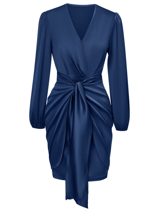 Vestido casual de manga larga con cuello en V y cintura con lazo de color sólido para mujer