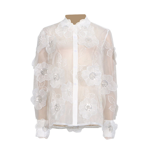Camisa de moda con cuello de polo, industria pesada, bordado de organza, flores tridimensionales, costura de lentejuelas, sentido del diseño