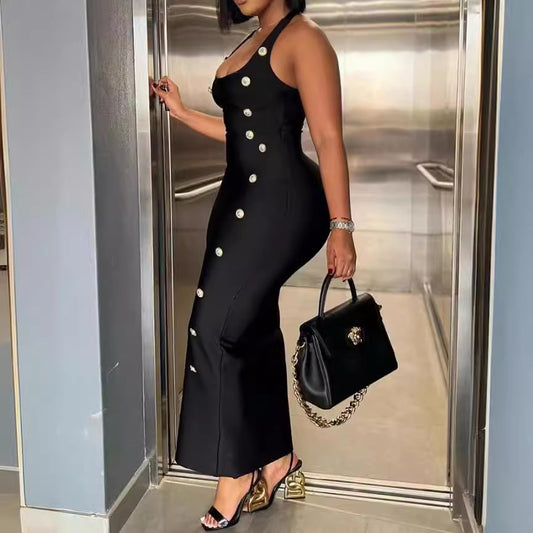 Vestido con tirantes y cintura alta, corte entallado y botones