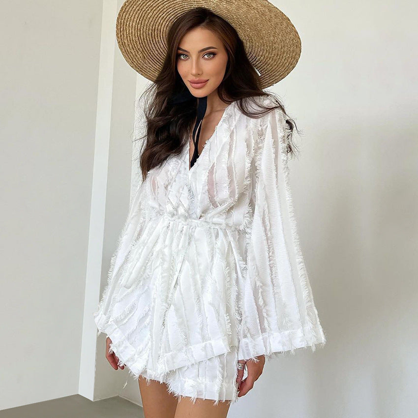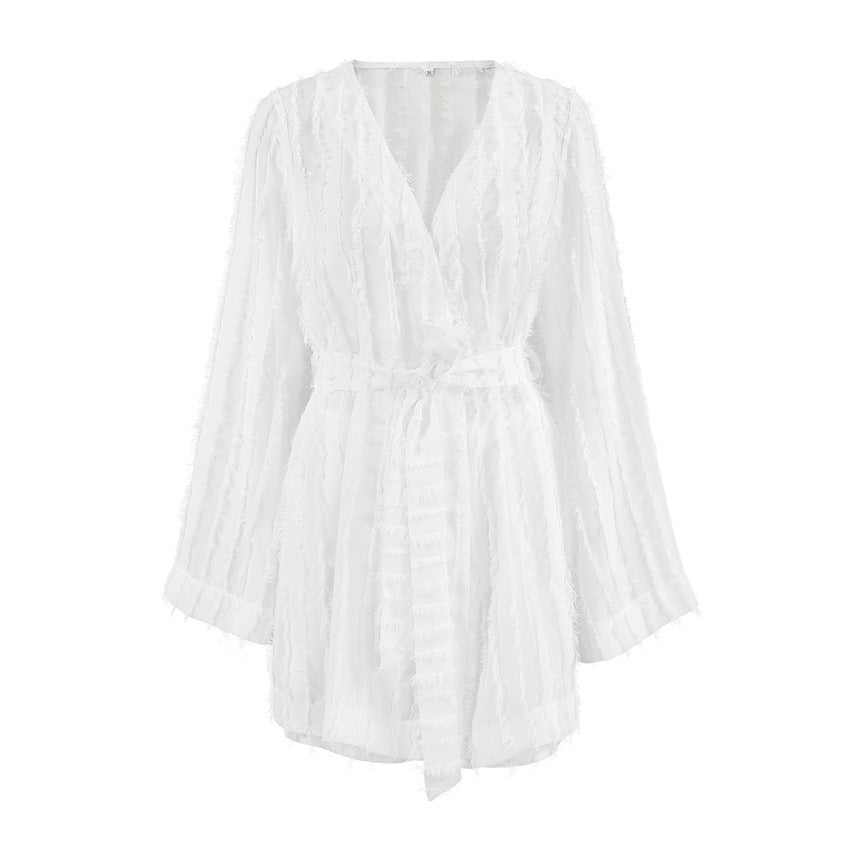 Camisón corto de manga larga con plumas de moda, conjunto de dos piezas para mujer
