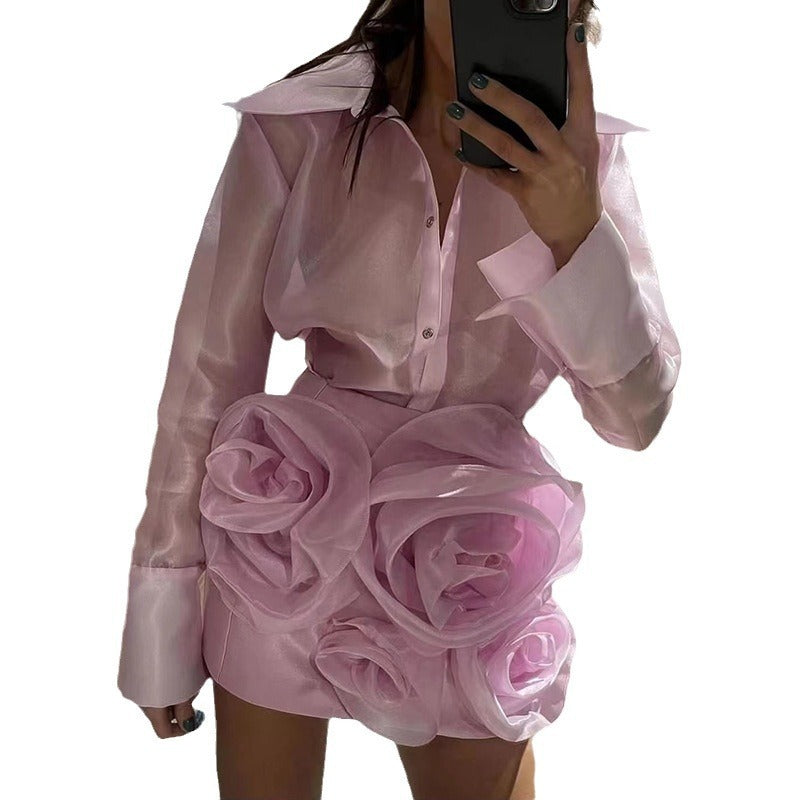 Traje de mujer con falda de flores y camisa ligera transparente con solapa