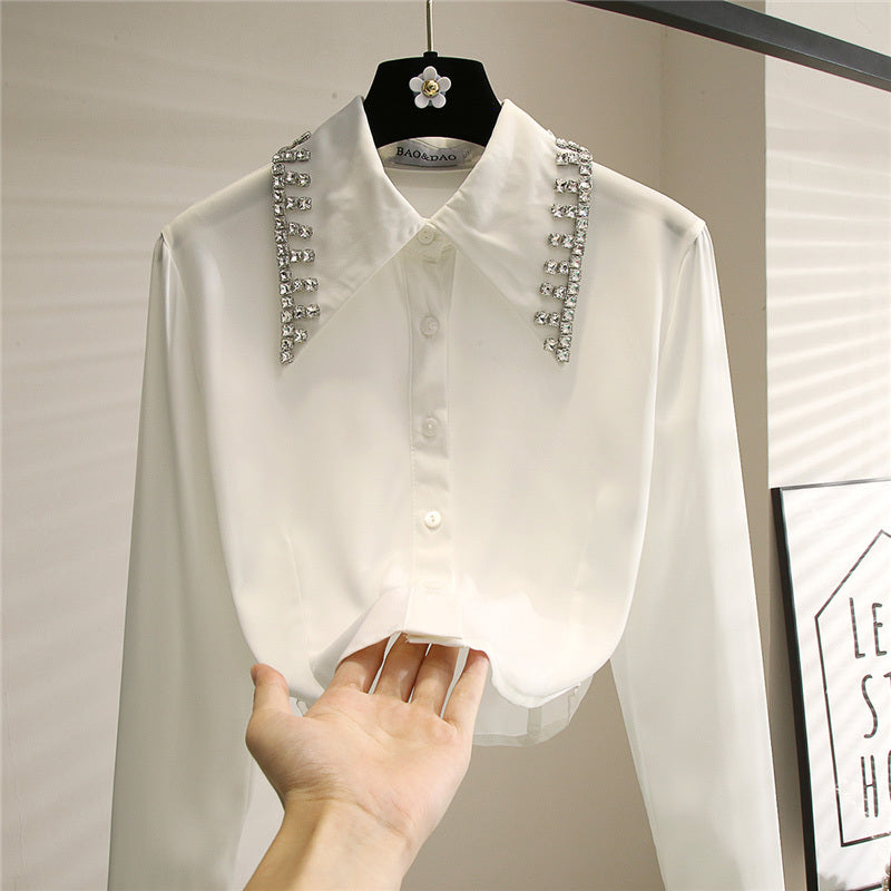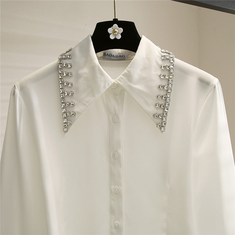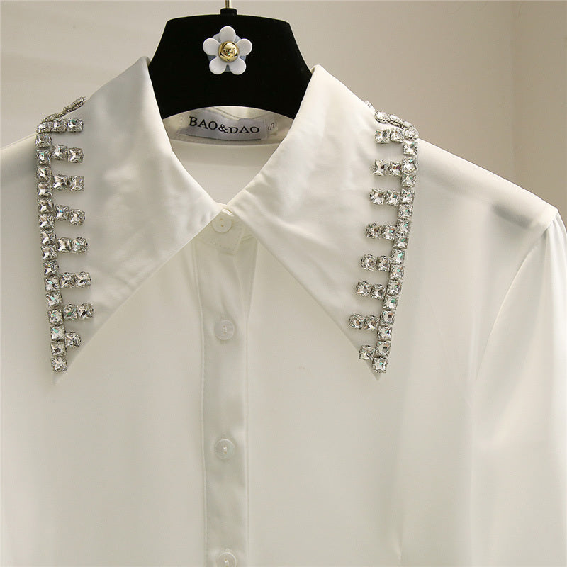 Cárdigan de manga larga Camisa blanca corta con diamantes de imitación