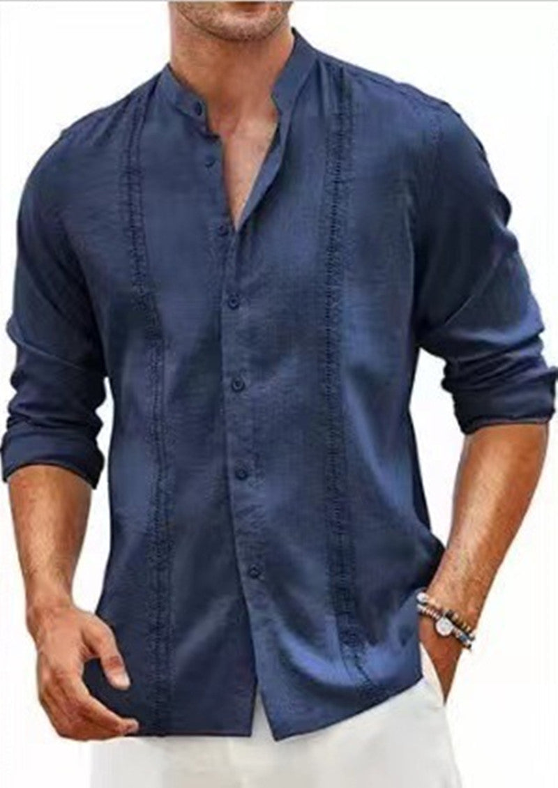 Camisa informal de manga larga con cuello alto de algodón y lino a la moda para hombre