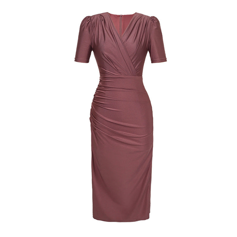 Vestido morado de alta calidad, ajustado, con escote en V francés retro