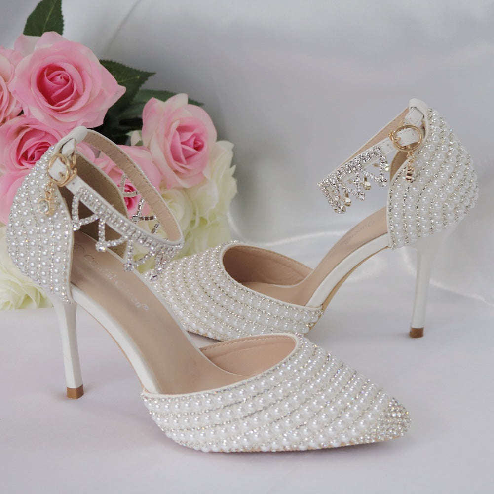 Zapatos de tacón alto con punta en punta y tacón de aguja con tiras de diamantes de imitación