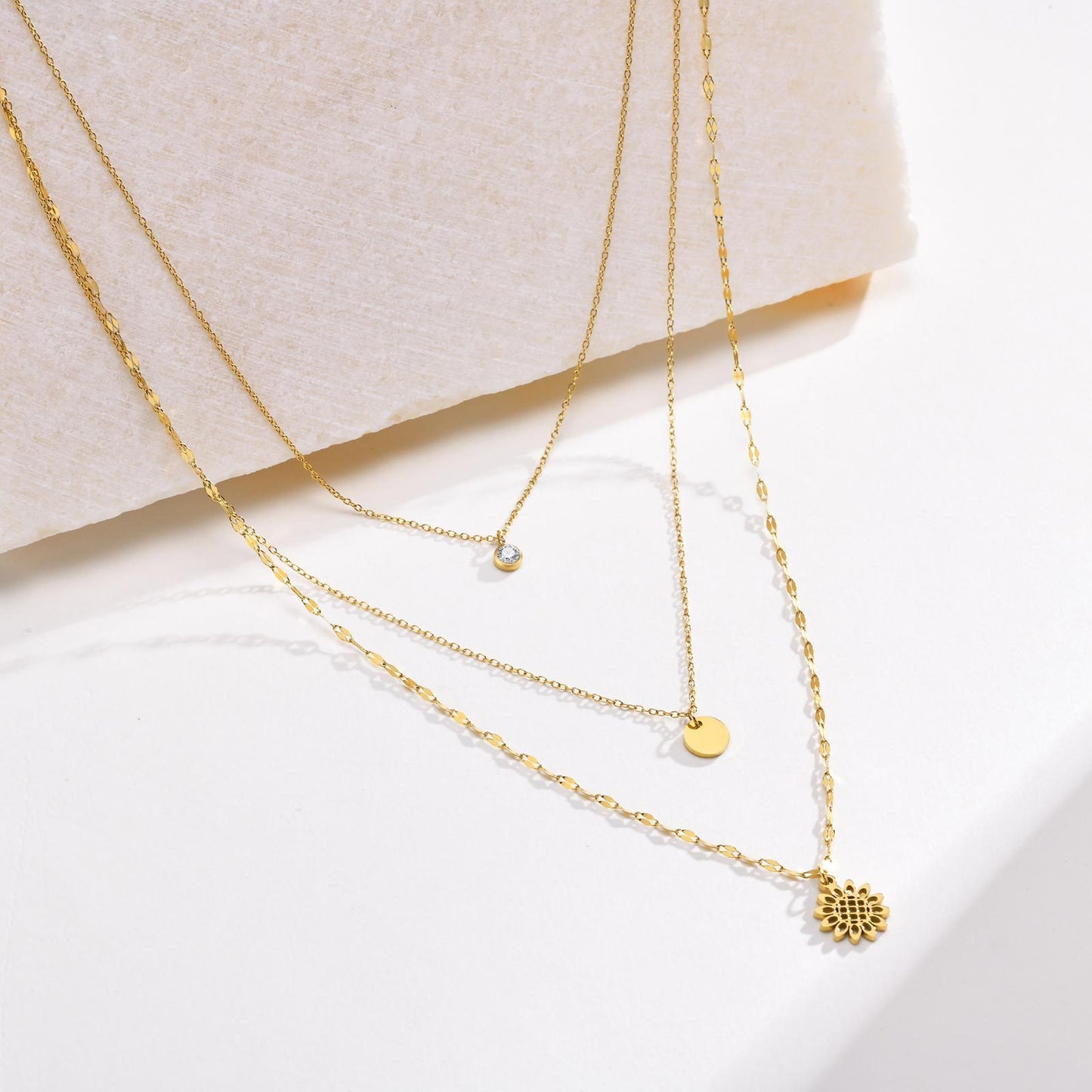 Collar doble de tres capas con diseño de girasol y circonita redonda de acero inoxidable para mujer
