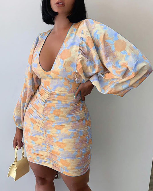 Robe imprimée à manches longues et col en V pour femme, nouveau style