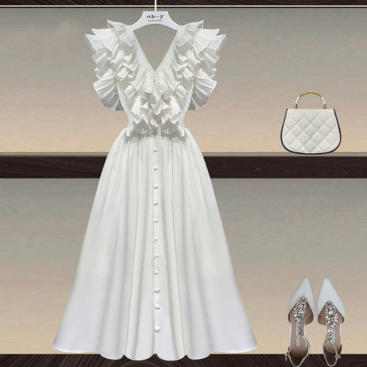 Robe plissée à col d'oreille en bois et à volants fins à lacets