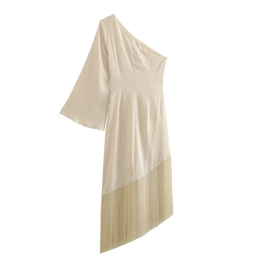 Robe décontractée plissée, coupe ajustée, coupe inclinée, bas à franges, une épaule, pour les vacances