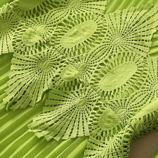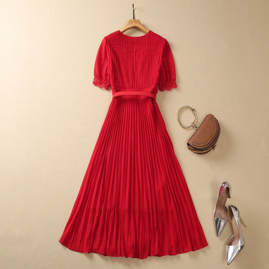 Robe en mousseline de soie taille haute à col en V et dentelle plissée