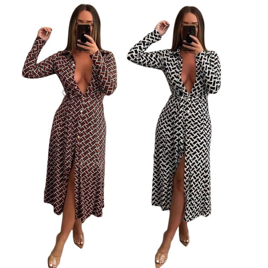 Robe longue décontractée à imprimé patchwork, col en V, manches longues et évasées