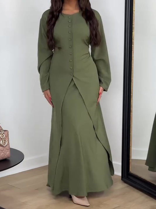 Robe unie à col rond et manches longues, coupe ajustée, avec lisière filiforme