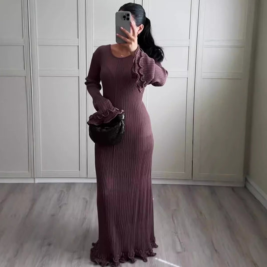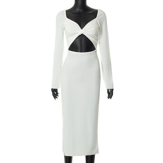 Robe élégante à manches longues, couleur unie, coupe ajustée, dos nu, ajourée, à porter dans les deux sens