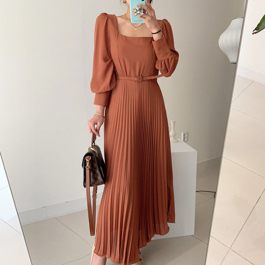 Robe longue plissée à col carré, taille fine, manches lanternes