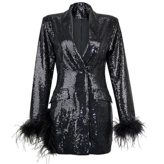 Costume printemps-été à paillettes et plumes