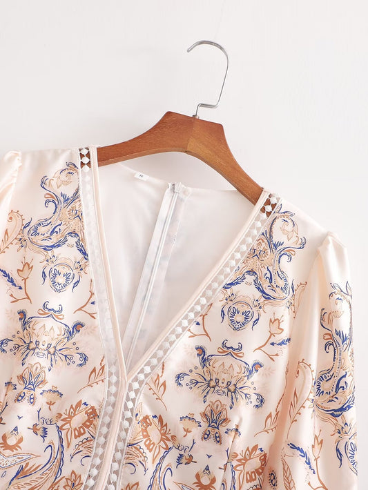 Robe imprimée printemps-été à col en V et manches lanternes