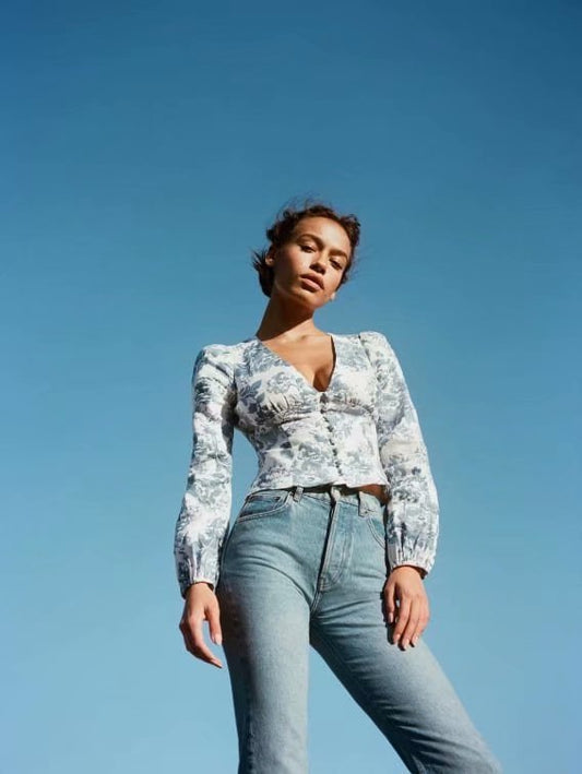 Chemise à col en V et imprimé porcelaine bleu et blanc pour vacances d'été