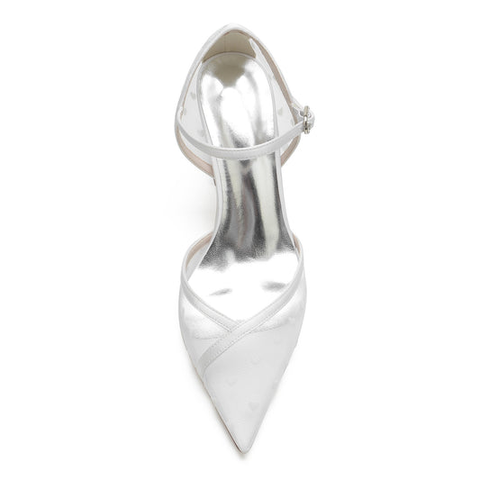 Chaussures de mariage blanches à pois transparents, bout pointu, talon épais, dentelle creuse