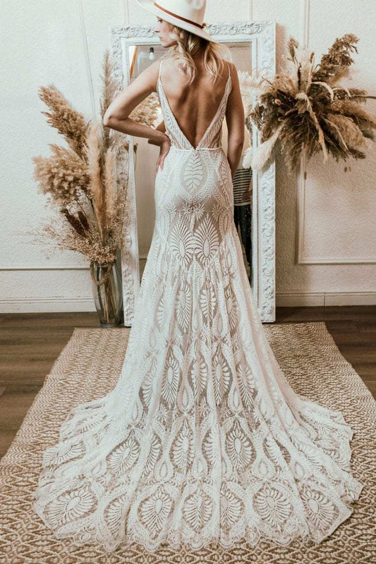 Robe De mariée bohème col en V dentelle Boho bretelles Spaghetti dos nu plage robes De mariée Vestido De Novia Roycebridal