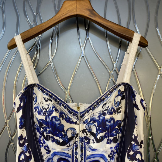 Robe moulante sans manches à col en V et imprimé porcelaine bleu et blanc vintage