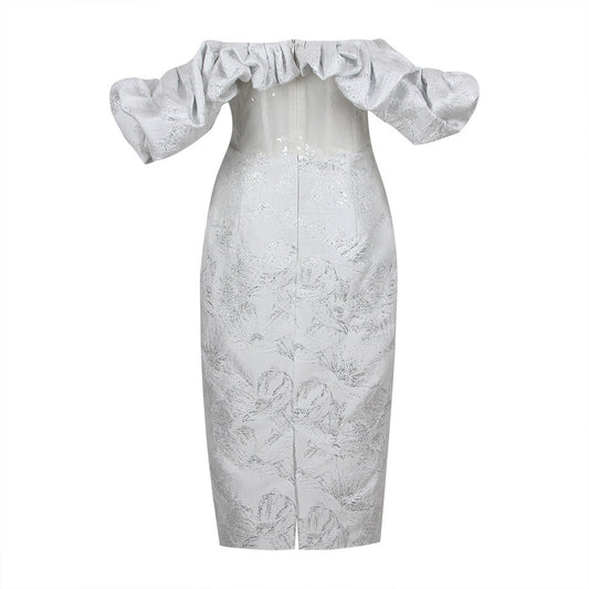 Robe mi-longue en jacquard sexy pour femme, dos nu, cache-cœur, col en V, fente en bas, haut de gamme, argentée