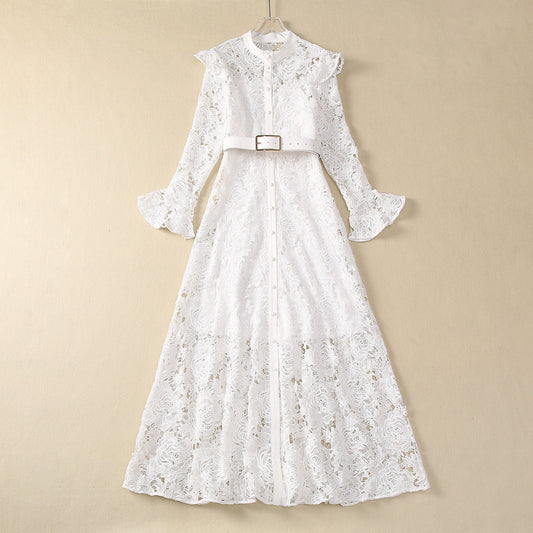 Robe à col montant et manches longues évasées de style français de haute qualité