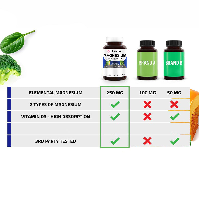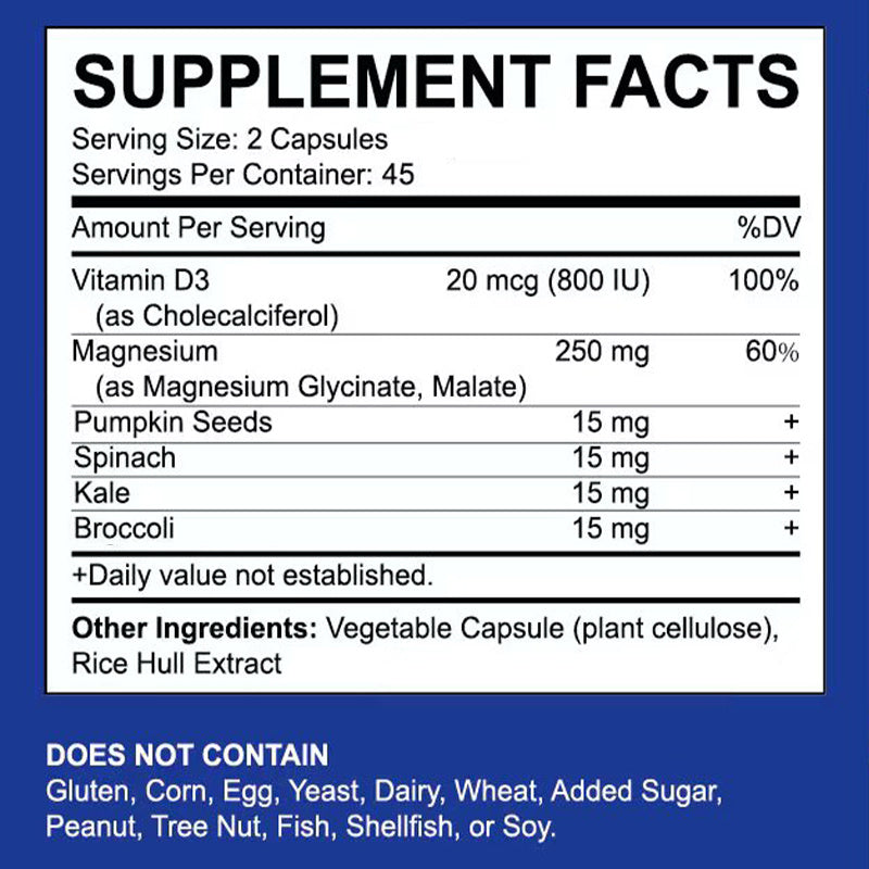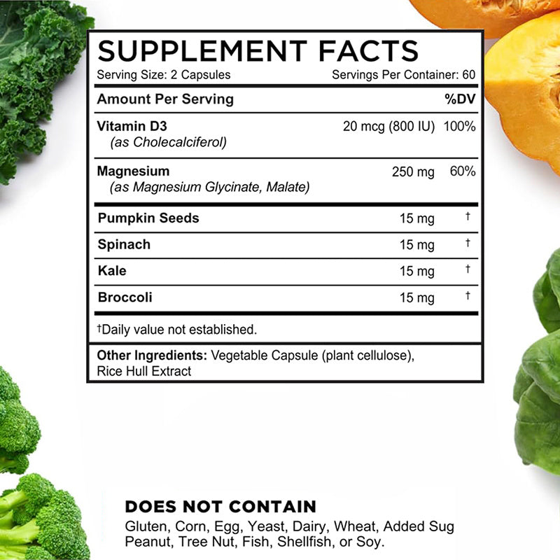 - MAGNÉSIUM ET VITAMINE D3 À ABSORPTION MAXIMALE : Nos comprimés de magnésium associent 250 mg de glycinate et de malate de magnésium, 800 UI de vitamine D3 et des légumes riches en magnésium comme les épinards, le tout dans des capsules faciles à avaler. Le magnésium s'associe parfaitement à la vitamine D3 pour favoriser la santé musculaire, la solidité osseuse et bien plus encore, sans effet laxatif.*