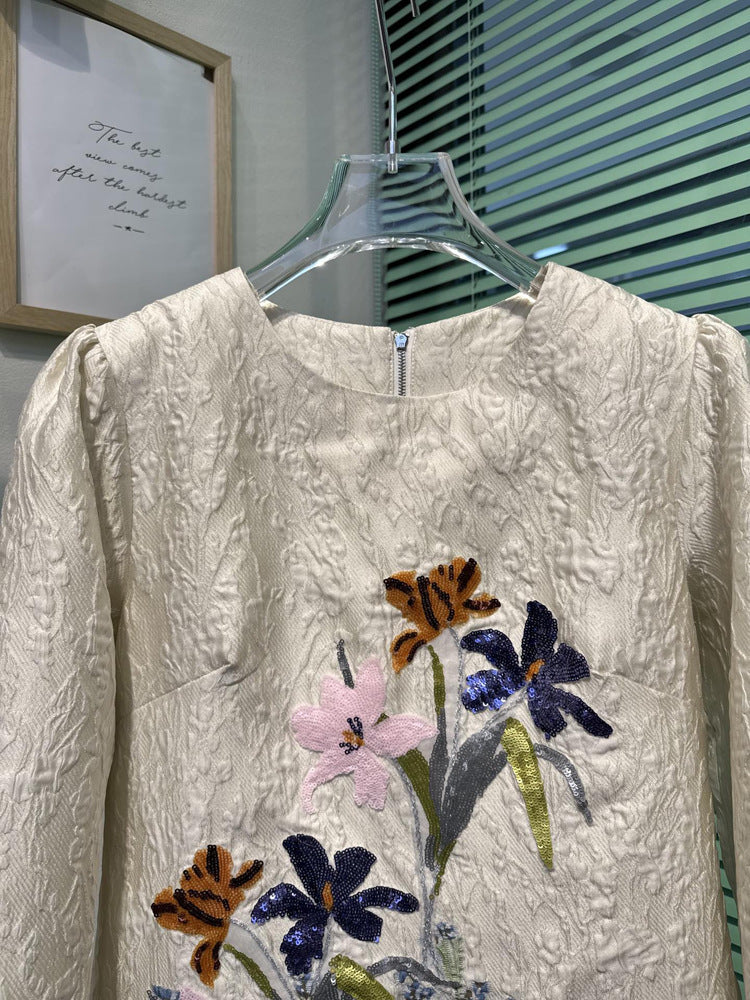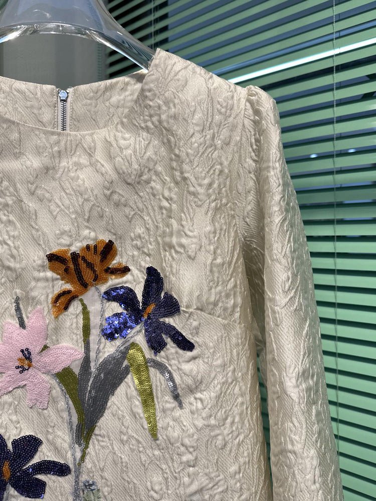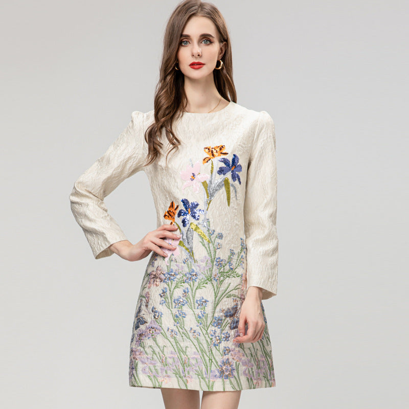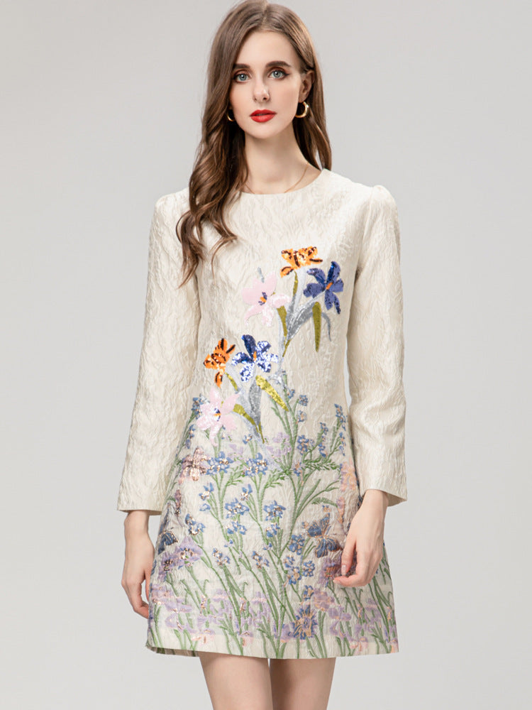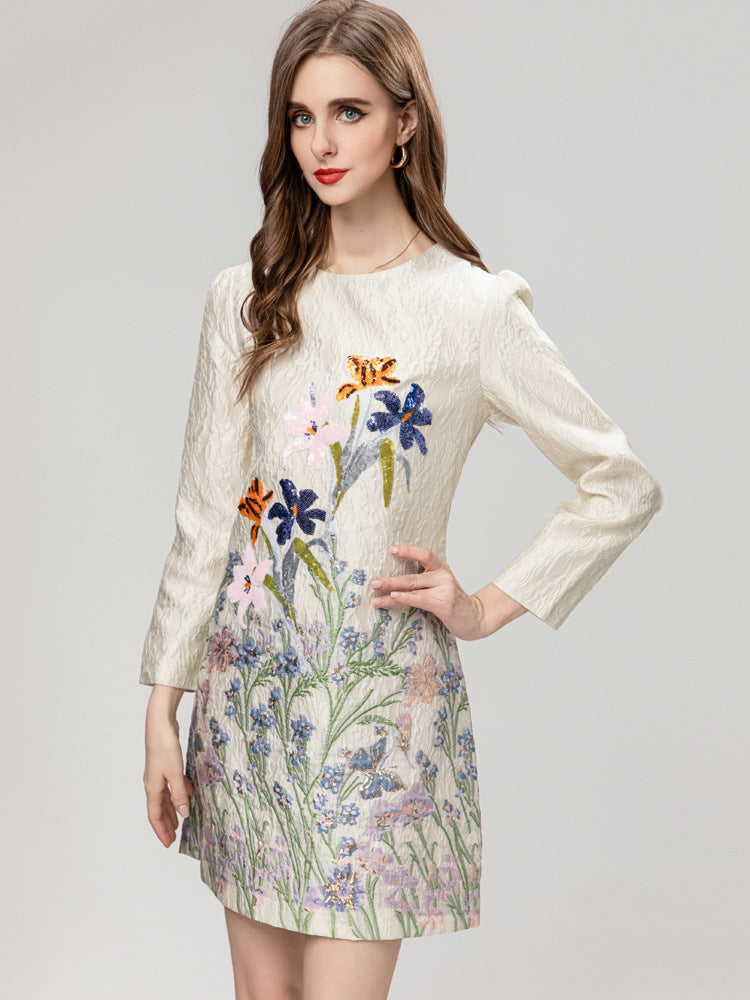 Robe courte à manches longues et imprimé jacquard Narcisse à paillettes et broderies lourdes