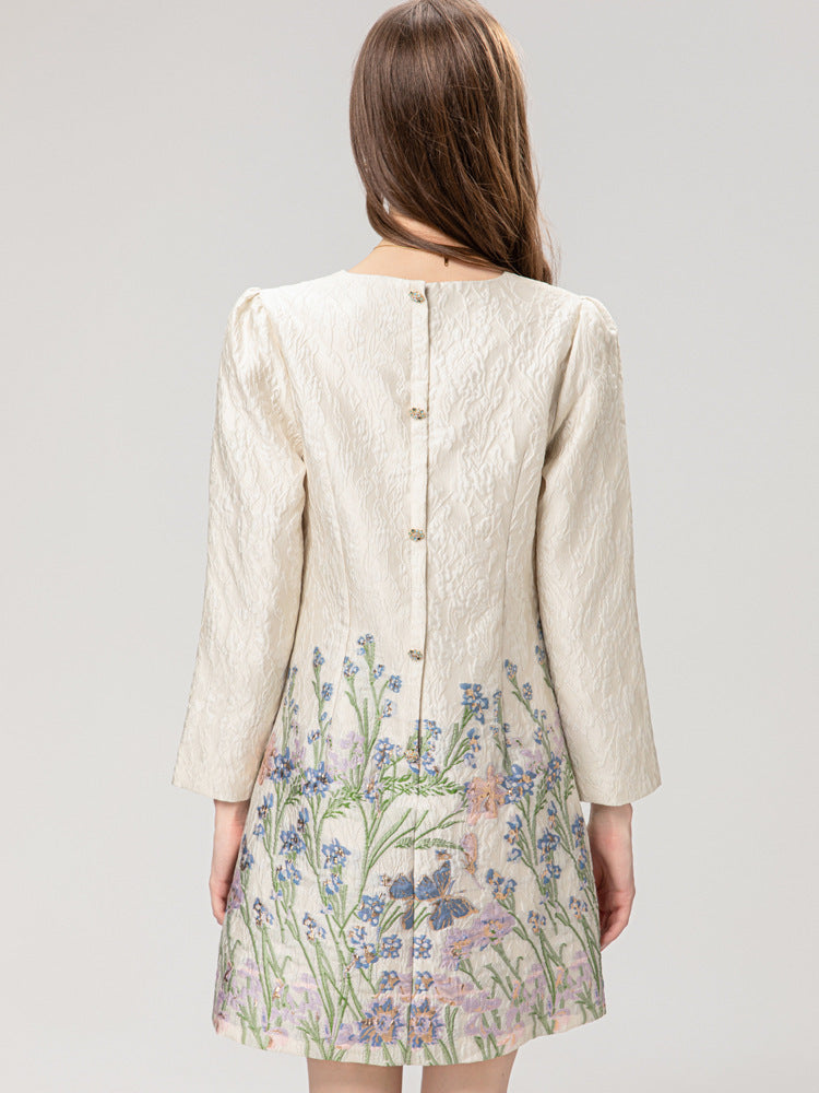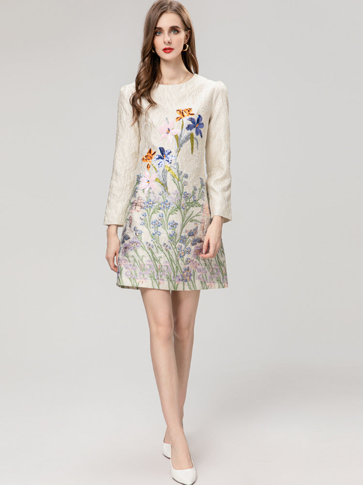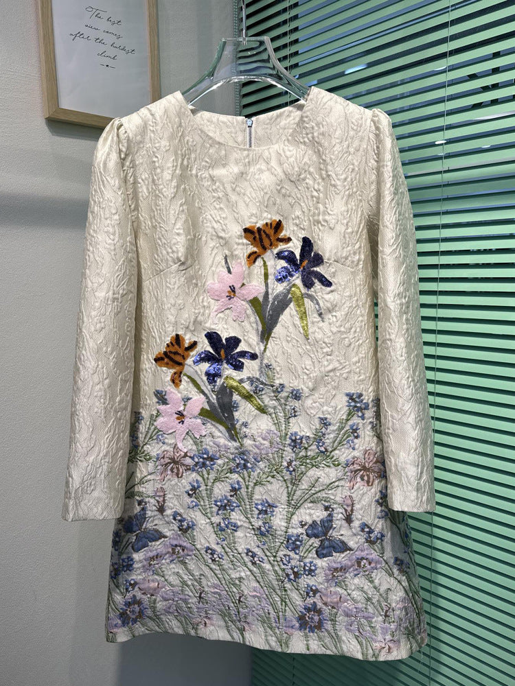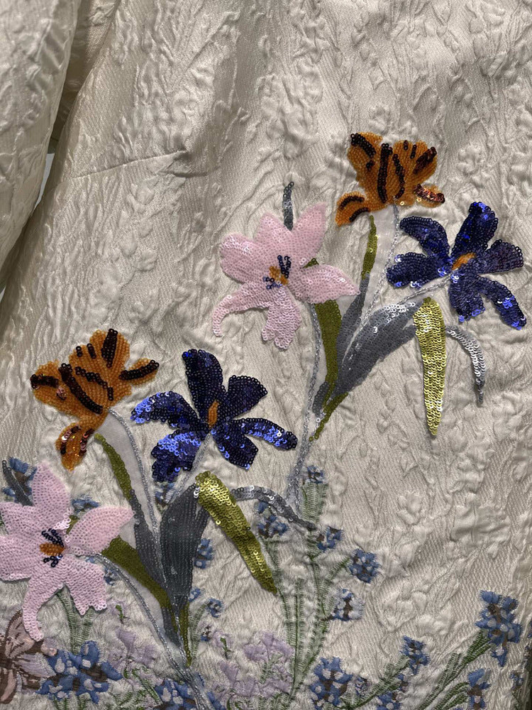 Robe courte à manches longues et imprimé jacquard Narcisse à paillettes et broderies lourdes