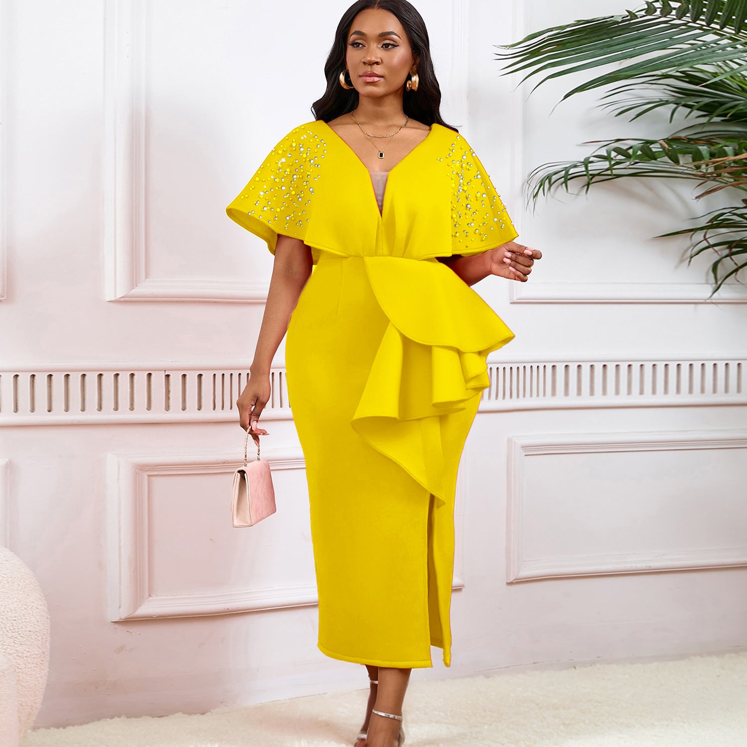 Robe femme à col en V, volants, rivets bifurqués et perles