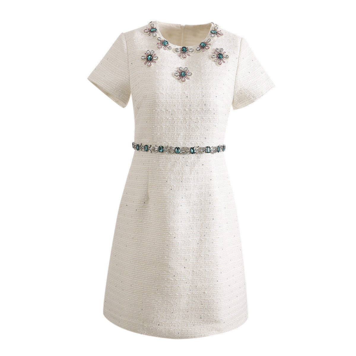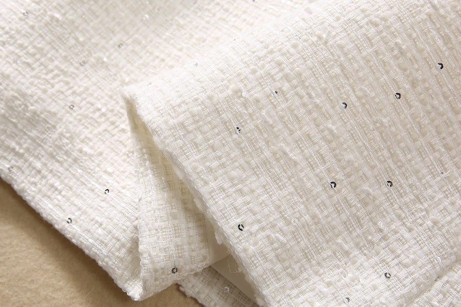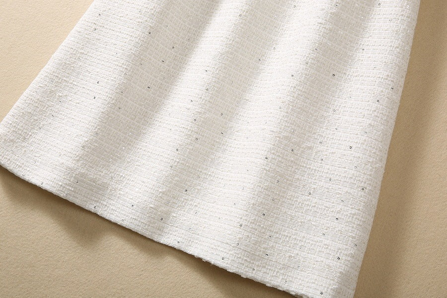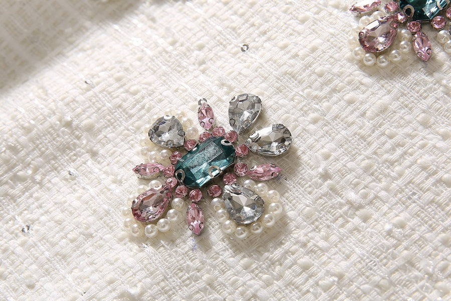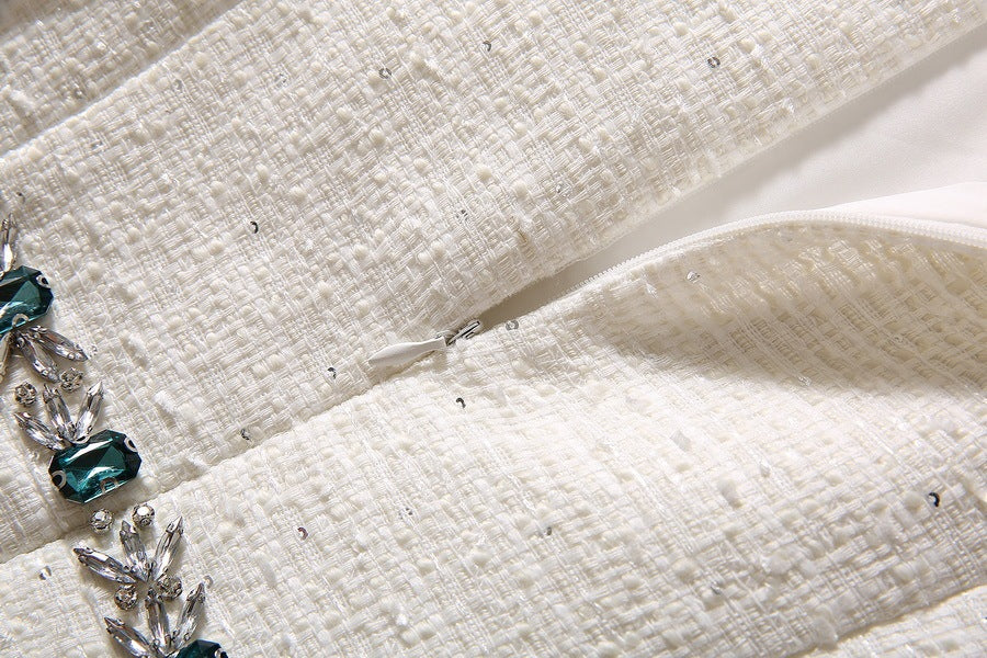 Robe moulante en tweed à sequins et perles et strass