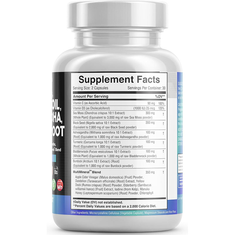 - Introducing the MultiMineral Blend - Sea Moss Pills, Black Seed Oil Pills, Ashwagandha Root, Bladderwrack Capsules and Burdock Root Capsules that contain 10+ powerhouse ingredients, turmeric curcumin capsules, Apple Cider Vinegar, Chlorophyll, Manuka Honey, and more! These sea moss bladderwrack burdock root capsules are alternatives to sea moss gummies, black seed oil gummies, and ashwagandha gummies for men. Not usual sea moss raw organic, wildcrafted sea moss gel or ashwagandha supplements.