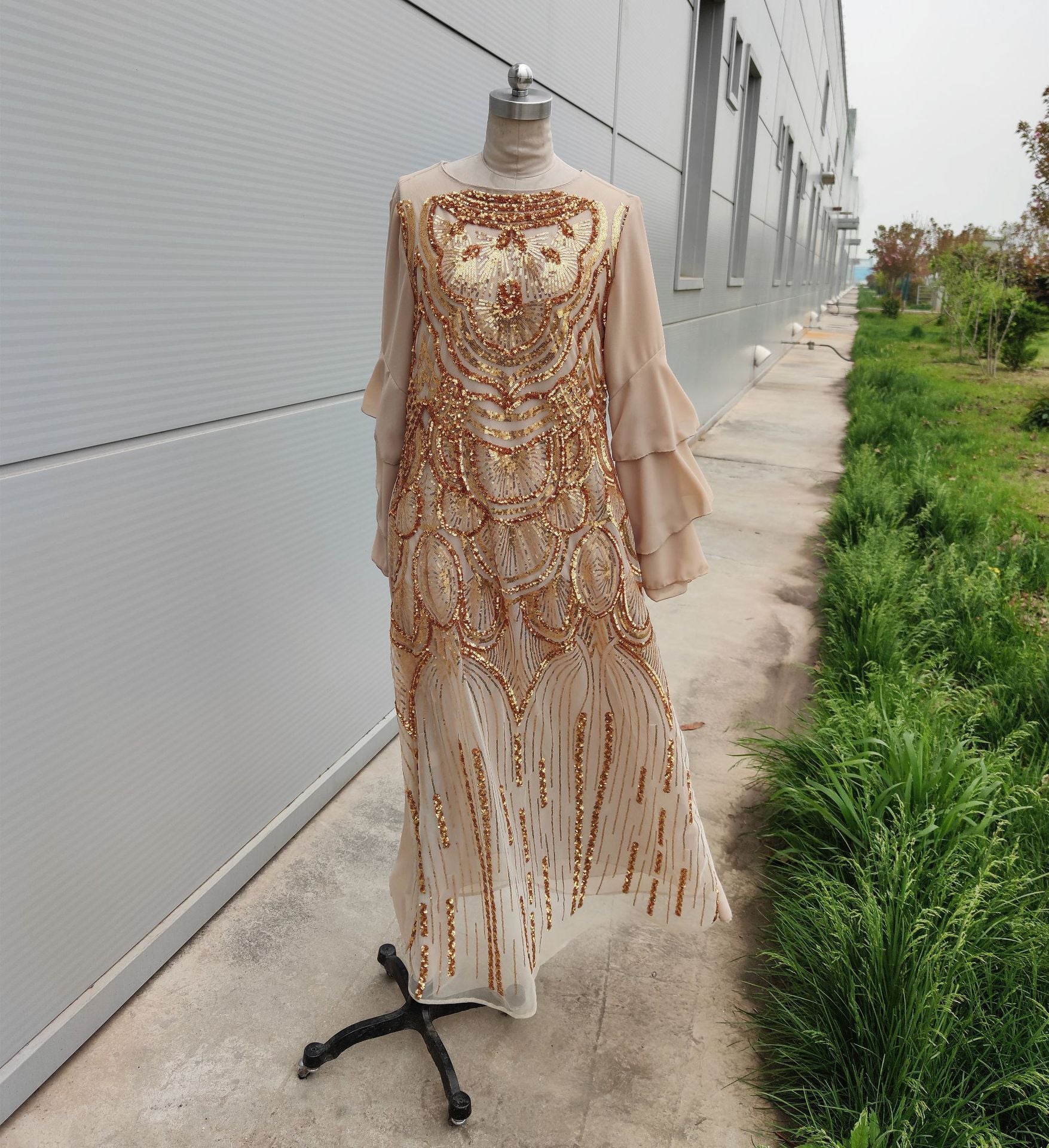 Gold Multi-layer Ruffle Sleeve Sequined Embroidered Dress