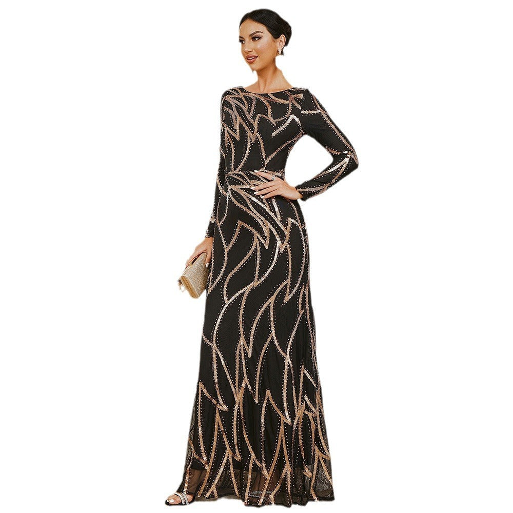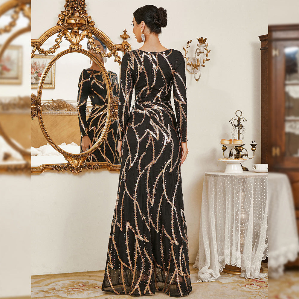 Long Sleeve Round Neck Sexy Long Sequined Banquet Dress