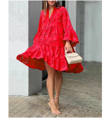Summer Flower Hollow-out Embroidered V-neck 7-quarter Sleeve Large Swing Dress